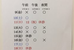 | 午前 8:30~11:30 | 大石 阿部 佐々木 神田 | 大田 大石 阿部 神田 | 大田 重平 佐々木 | 大田 重平 阿部 | 重平 大石 神田 | 大田 重平 大石 阿部 佐々木 神田 |